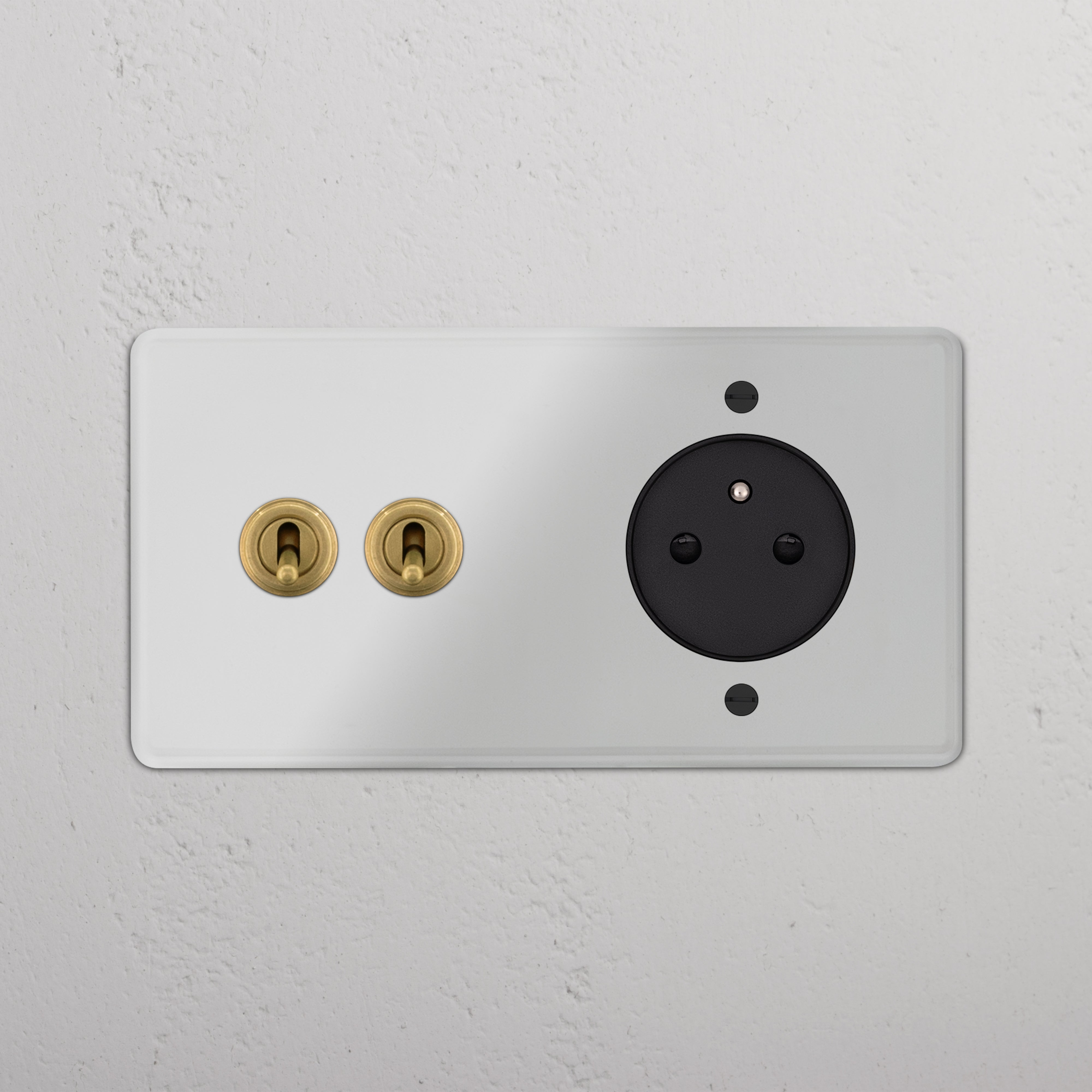 Dit product combineert twee wissel-tuimelschakelaars met een Frans/Belgische stopcontact op één dubbele afdekplaat.