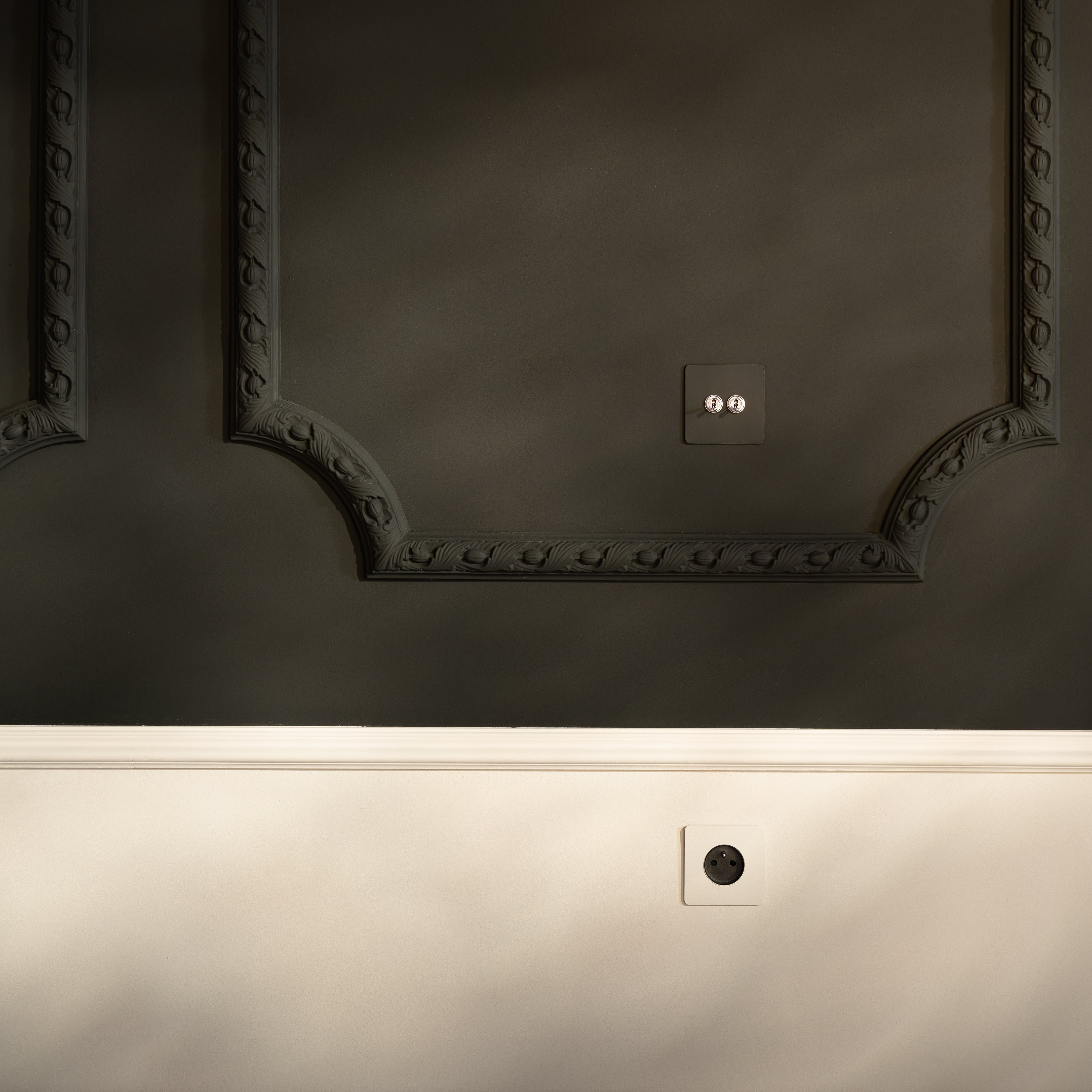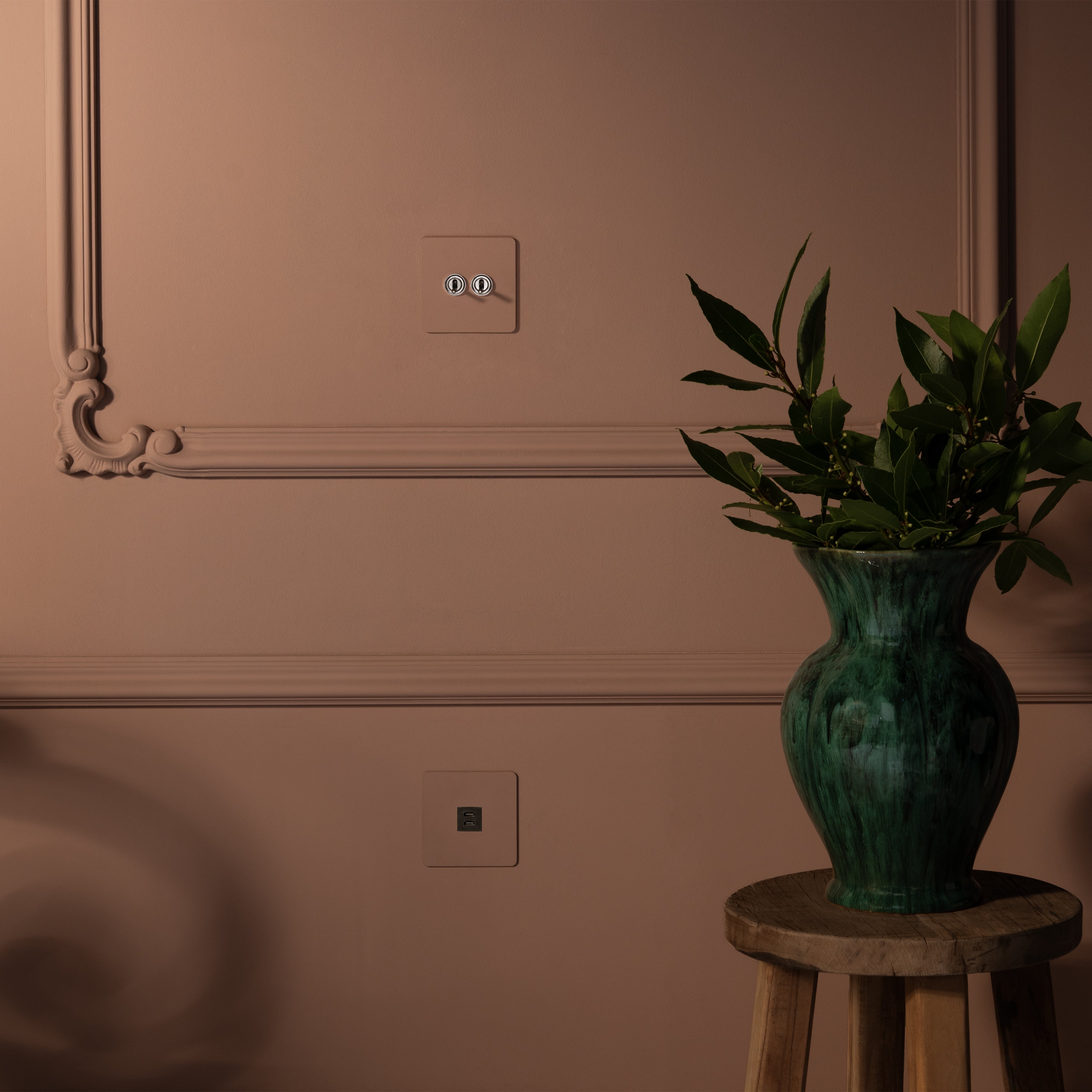 Wij bereiden onze beschilderbare afdekplaten voor met onze eigen etsende primer, zodat je ze gemakkelijk in dezelfde kleur als jouw muren kunt verven. De tuimelschakelaars zijn afgewerkt in gepolijst nikkel.
