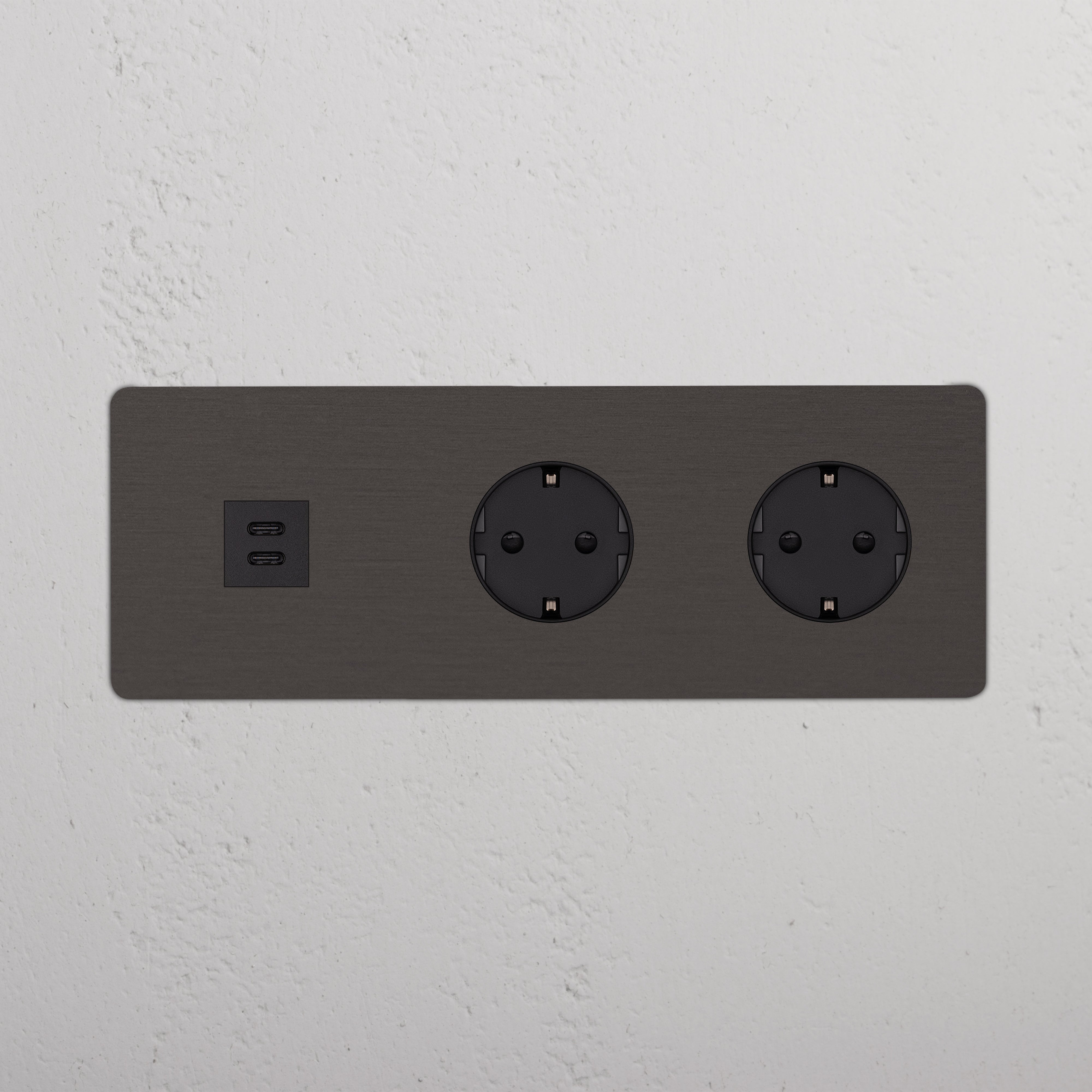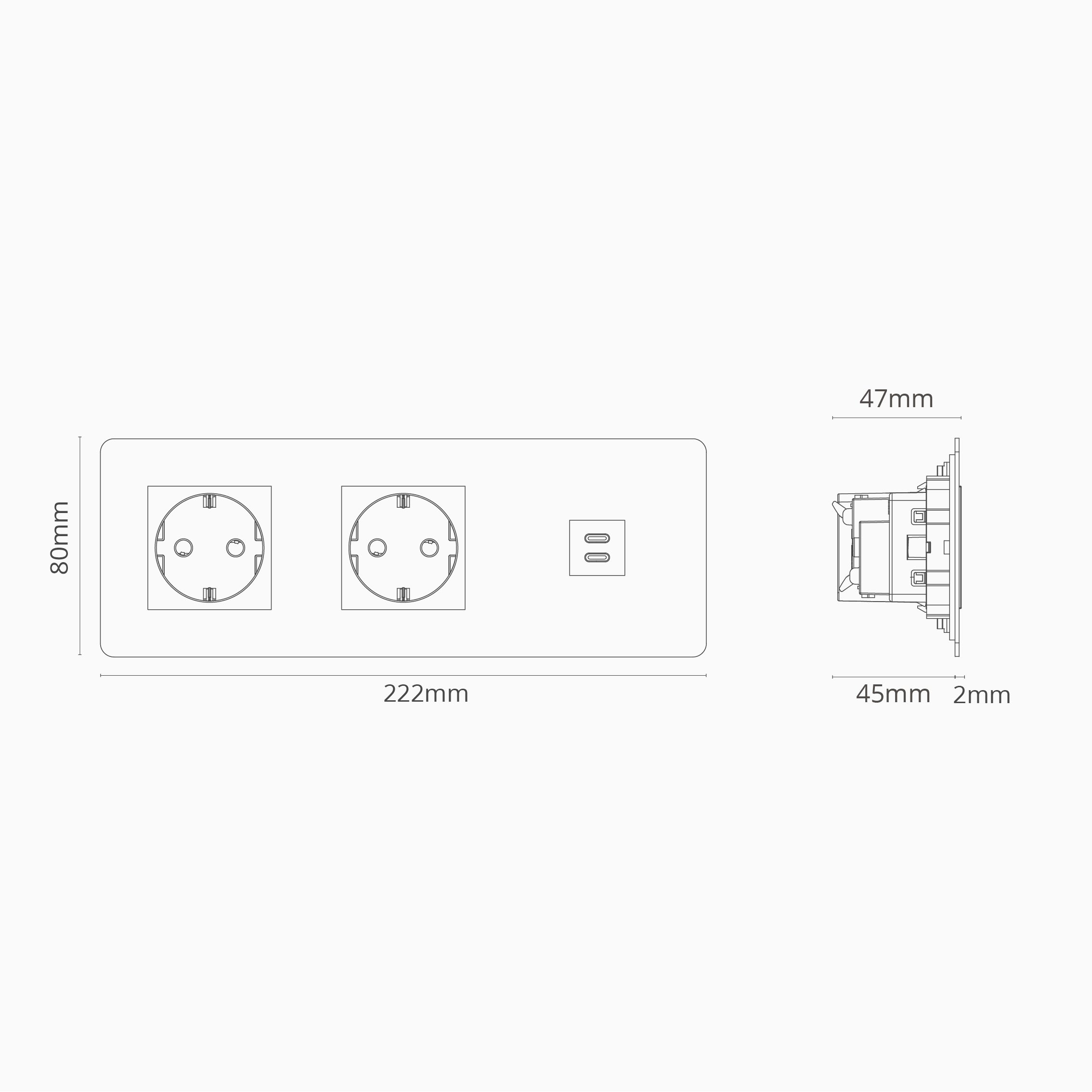 Dit product combineert een USB-C-voedingsmodule en twee Schuko-stopcontacten op één drievoudige afdekplaat.