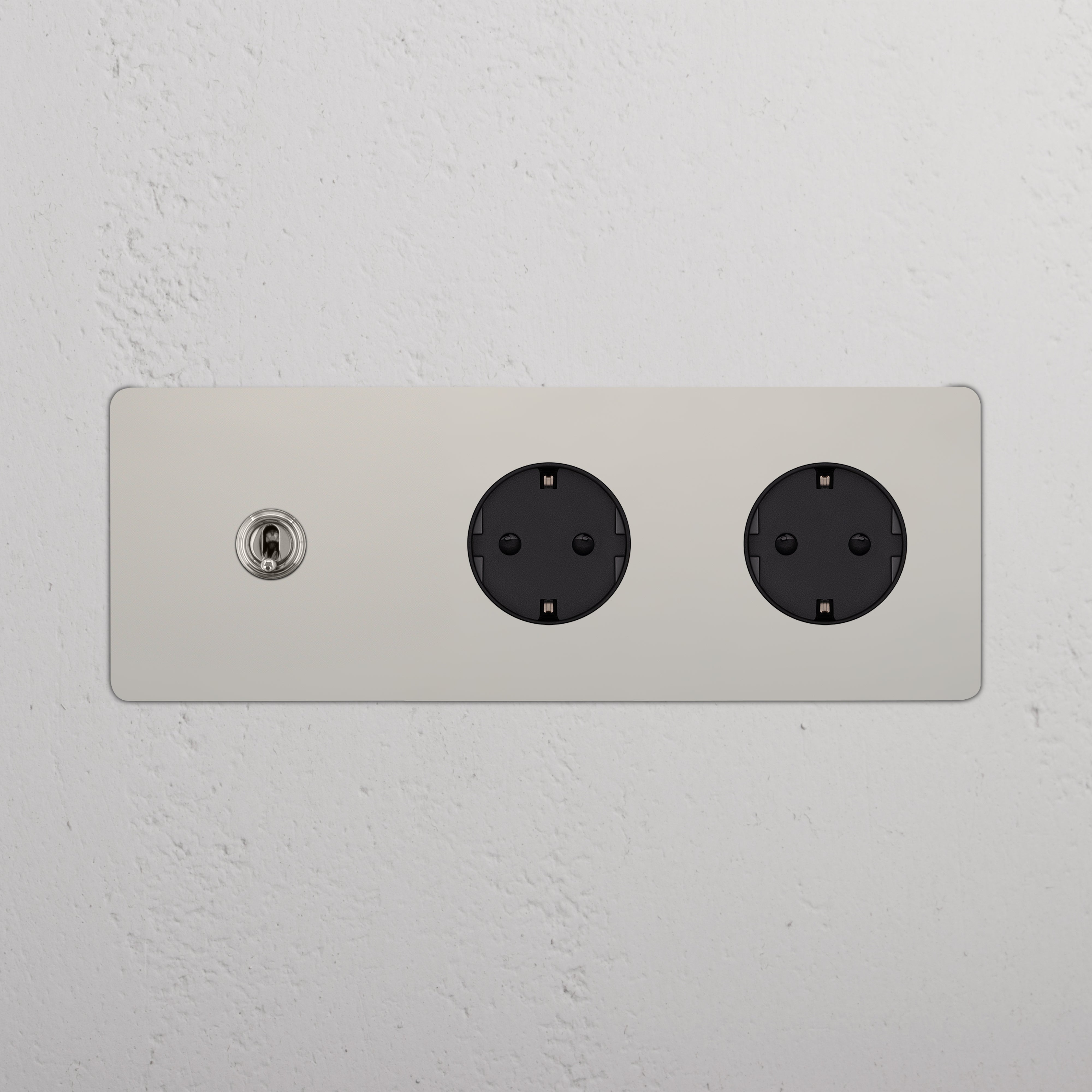 Dit product combineert een wissel-tuimelschakelaar met twee Schuko-stopcontacten op één drievoudige afdekplaat.
