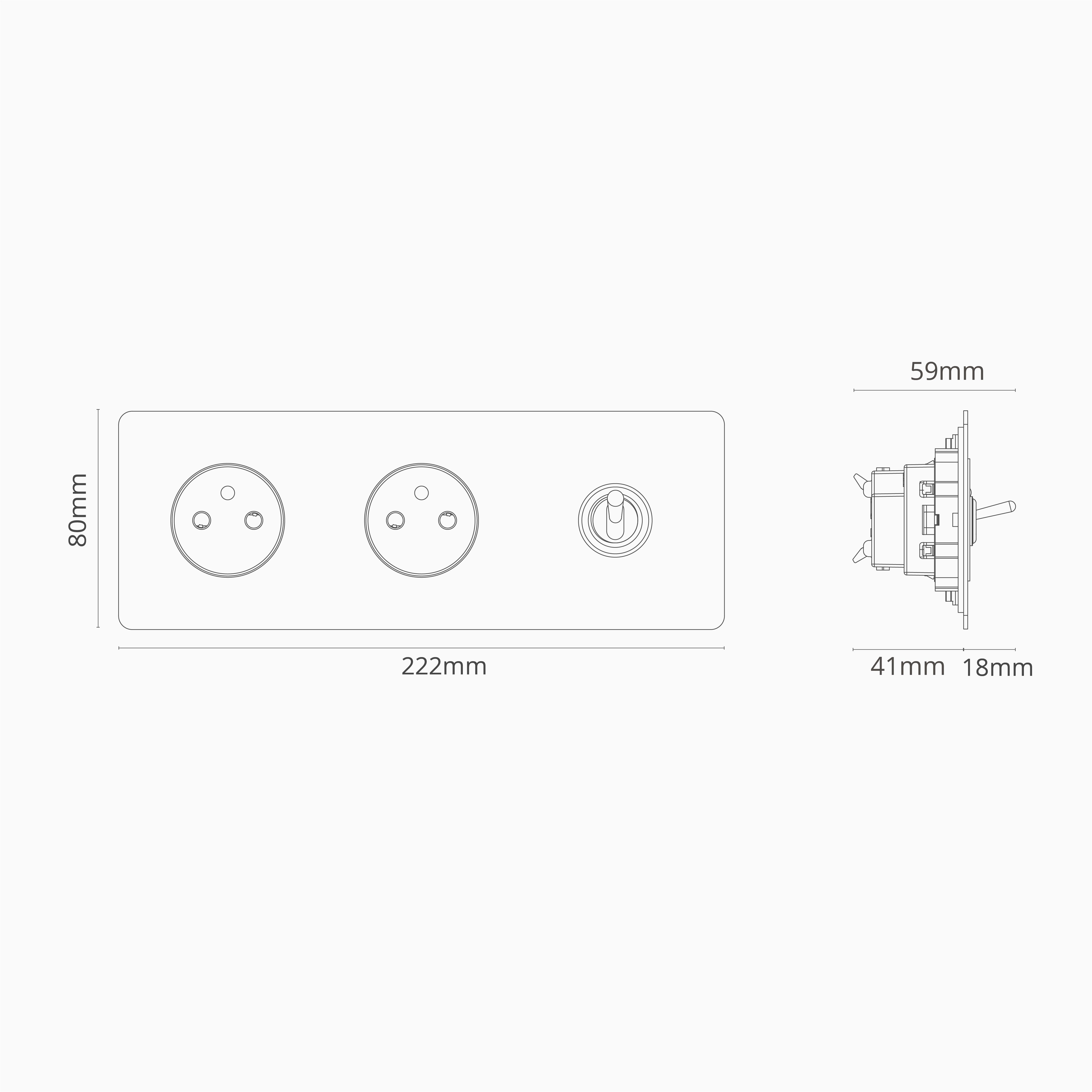 Dit product combineert een wissel-tuimelschakelaar met twee Frans/Belgische stopcontacten op één drievoudige afdekplaat.