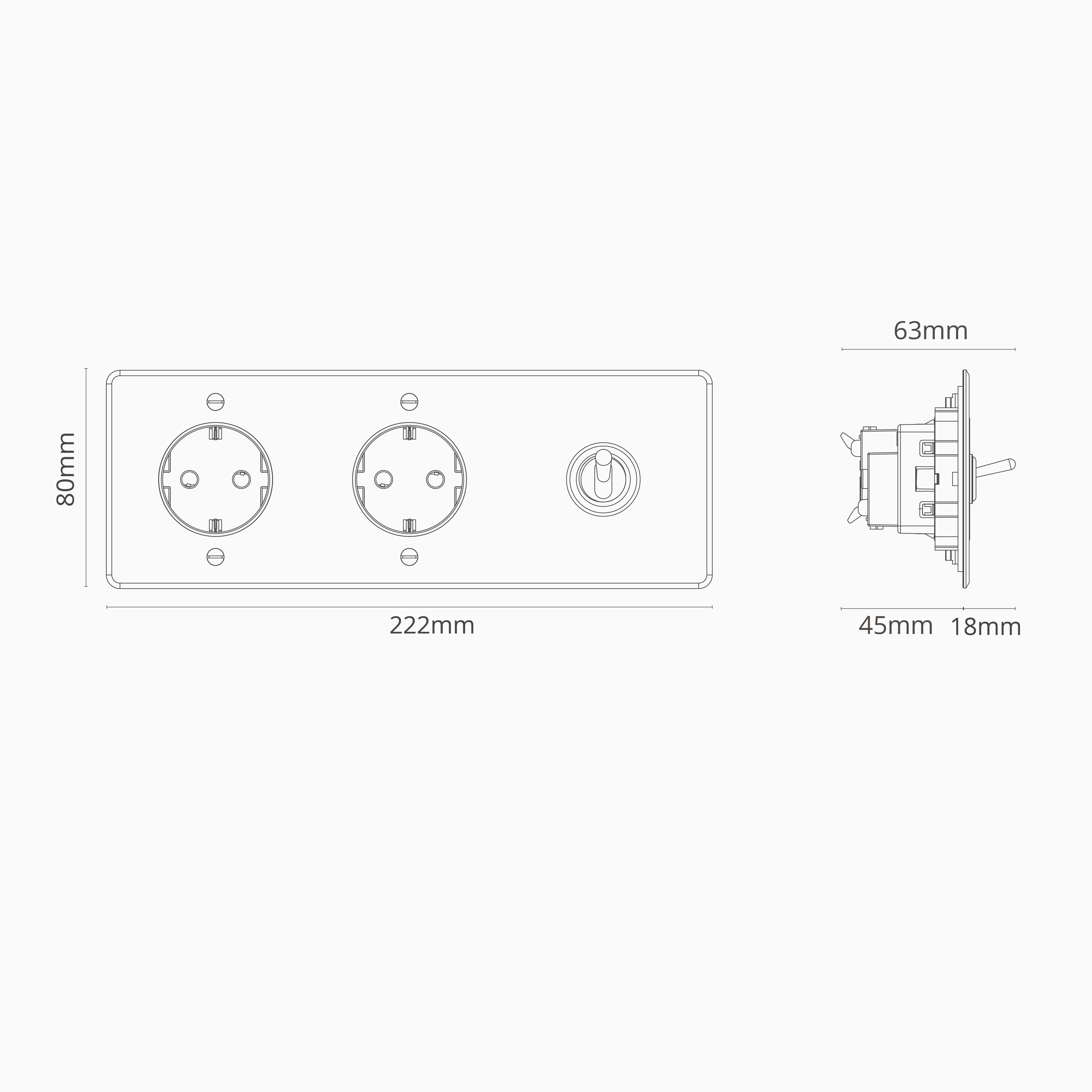 Dit product combineert een wissel-tuimelschakelaar met twee Schuko-stopcontacten op één drievoudige afdekplaat.