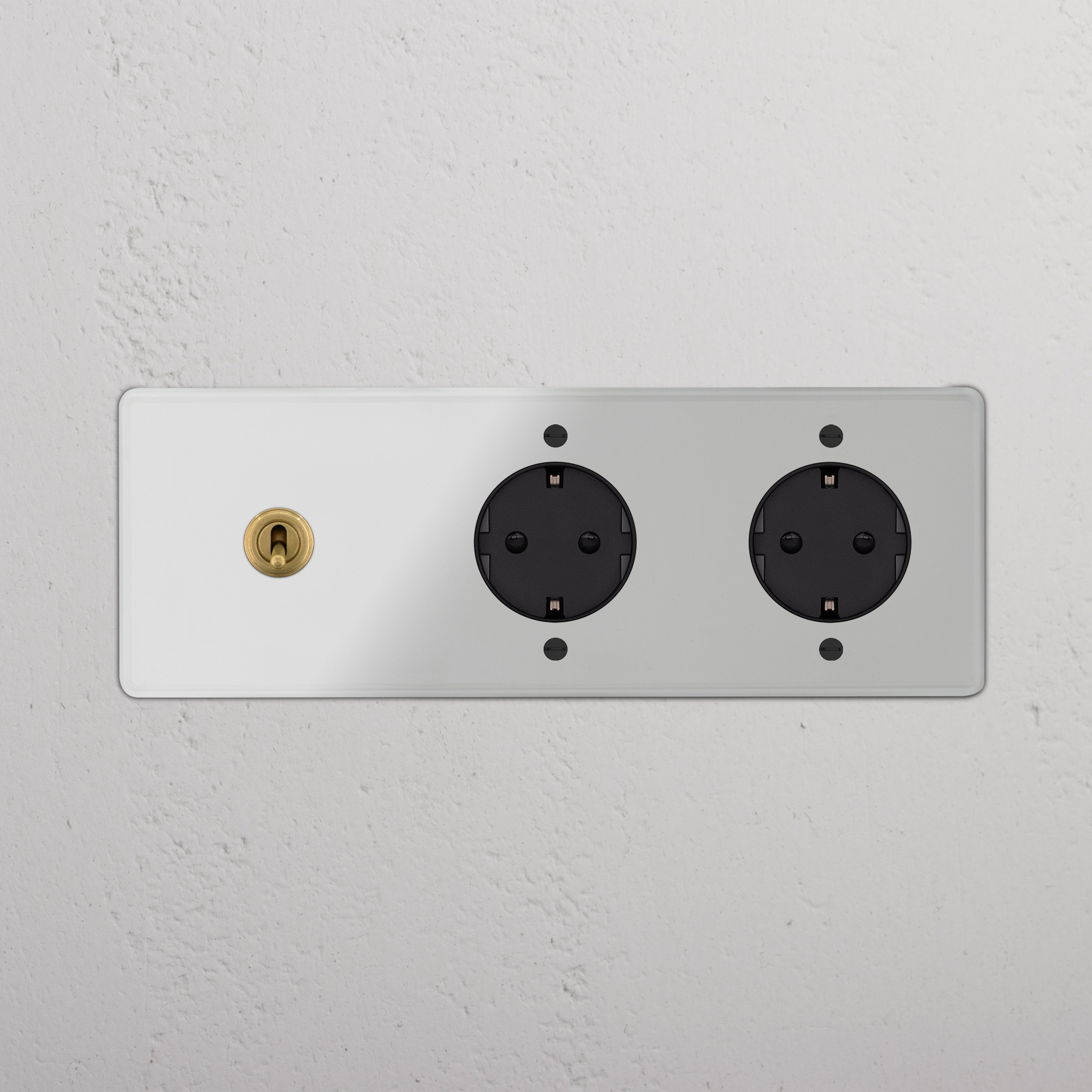 Dit product combineert een wissel-tuimelschakelaar met twee Schuko-stopcontacten op één drievoudige afdekplaat.