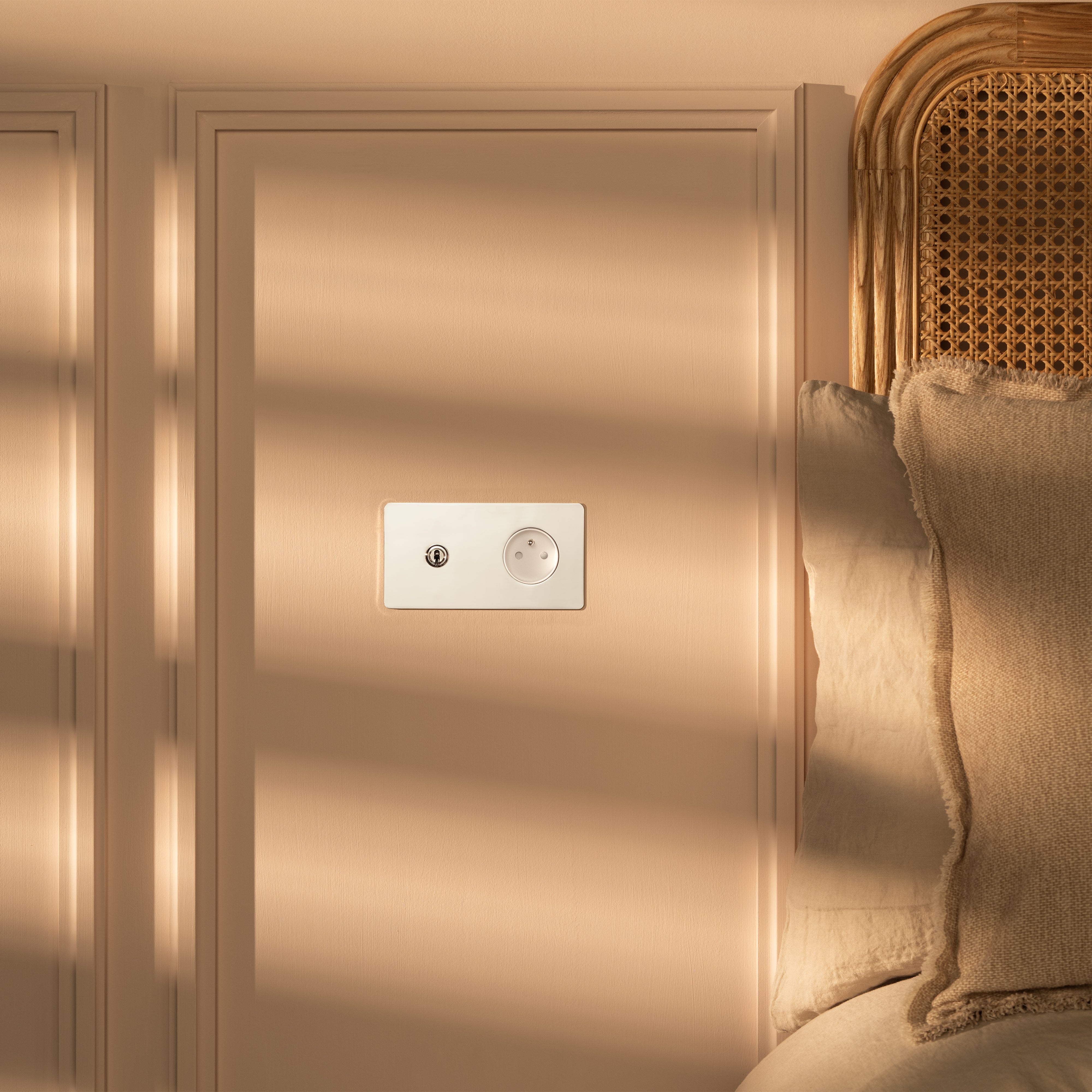 De matte, licht gestructureerde kunststof inzetstuk rond de stopcontact is verkrijgbaar in wit (zoals deze) of zwart.