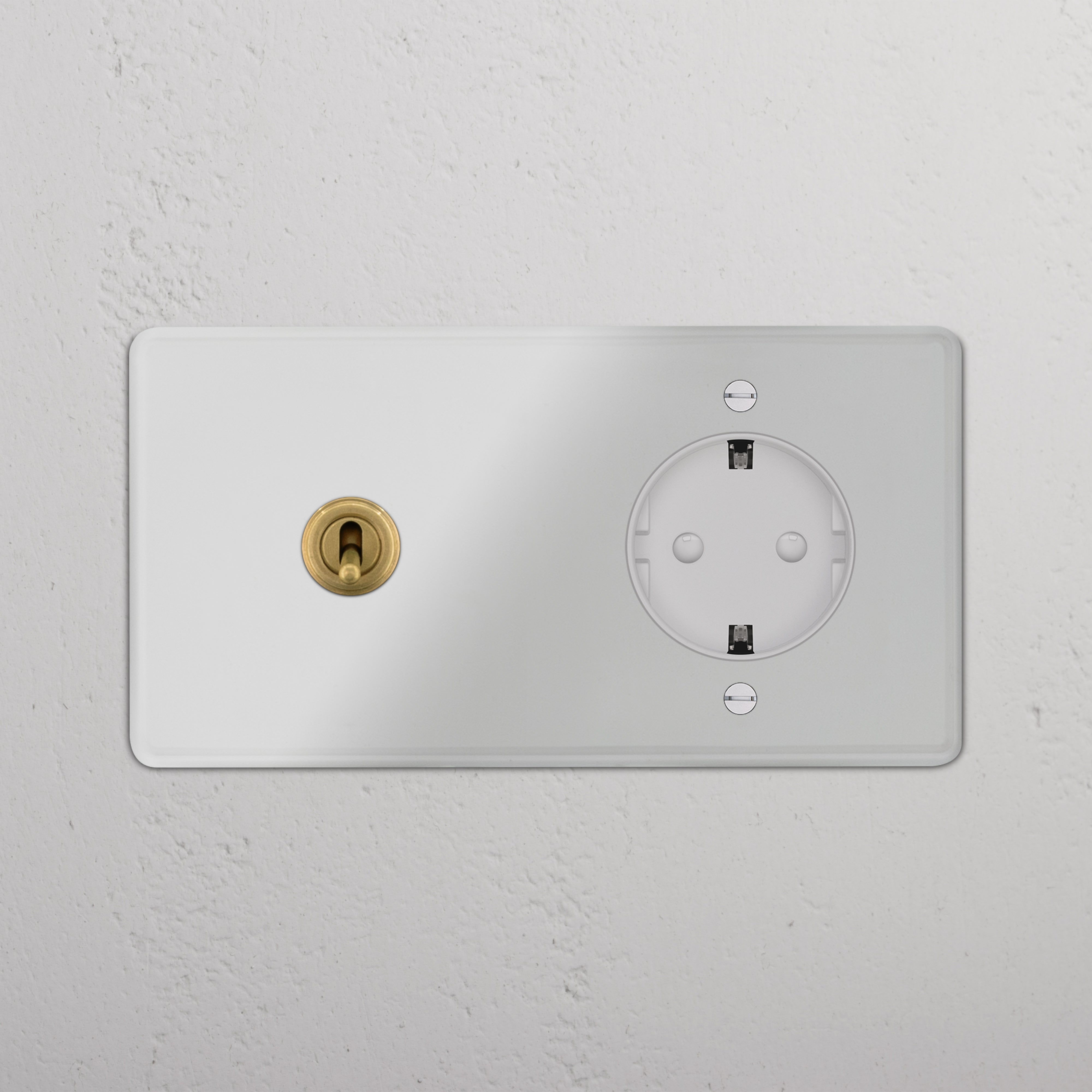 Dit product combineert een wissel-tuimelschakelaar met een Schuko-stopcontact op één dubbele afdekplaat.