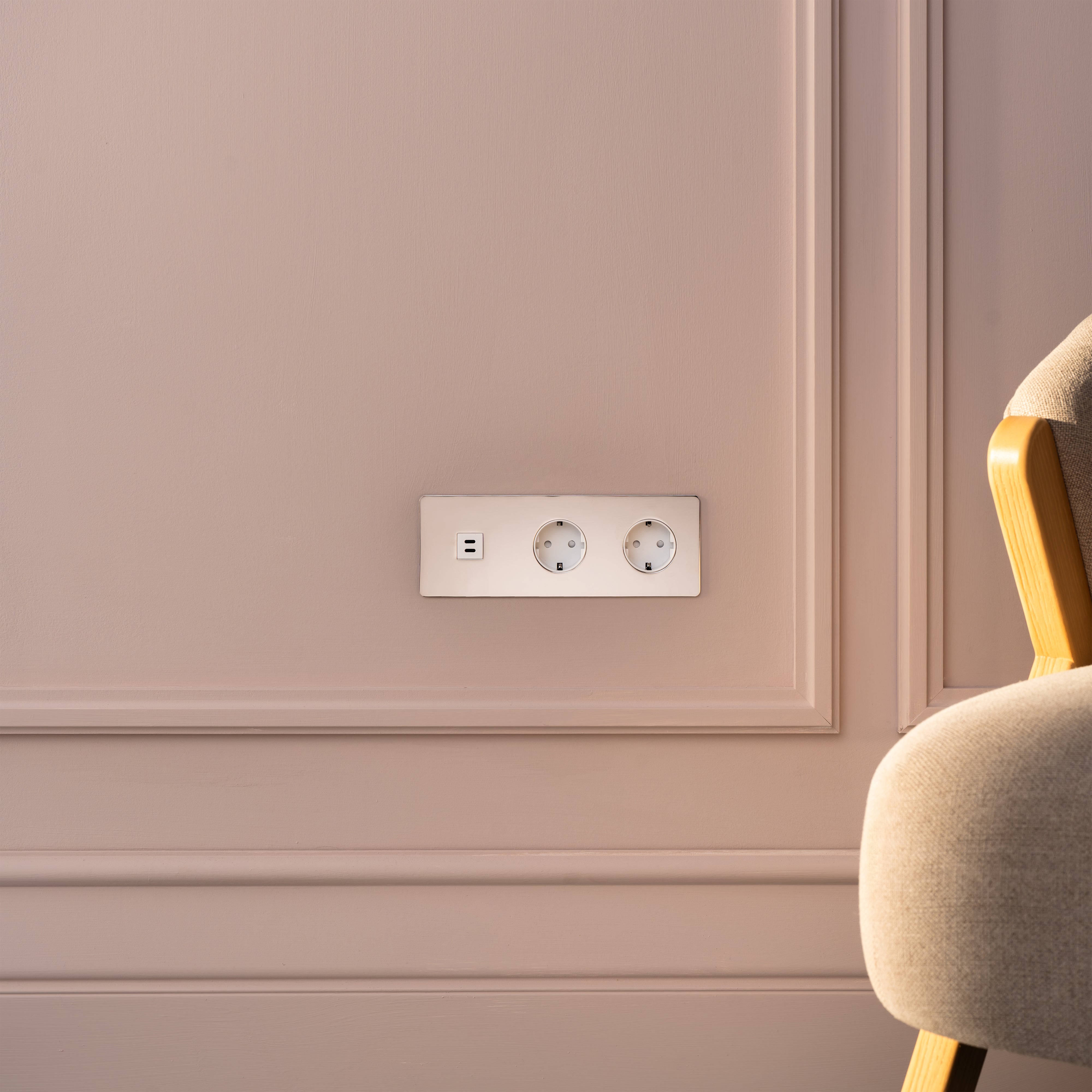 Dit product combineert een USB-C-voedingsmodule en twee Schuko-stopcontacten op één drievoudige afdekplaat.