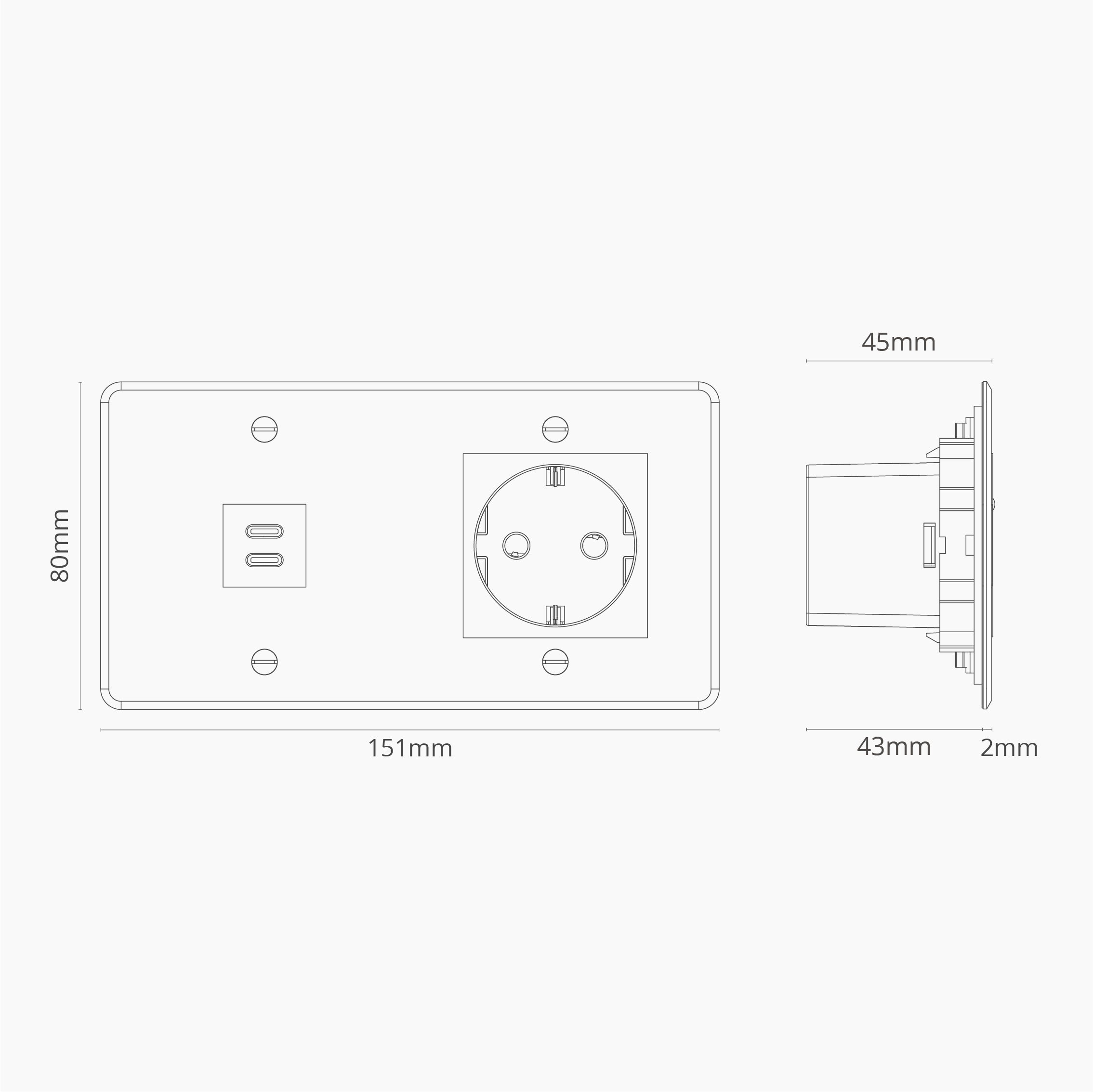 Dit product combineert een USB-C-voedingsmodule en een Schuko-stopcontact op één dubbele afdekplaat.